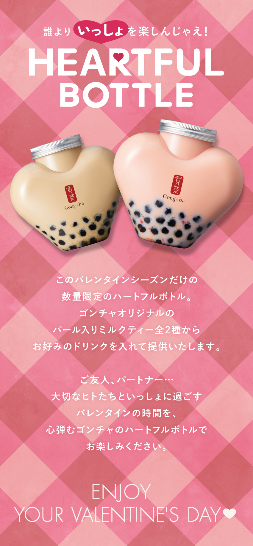 このバレンタインシーズンだけの数量限定のハートフルボトル。ゴンチャオリジナルのパール入りミルクティー全2種からお好みのドリンクを入れて提供いたします。