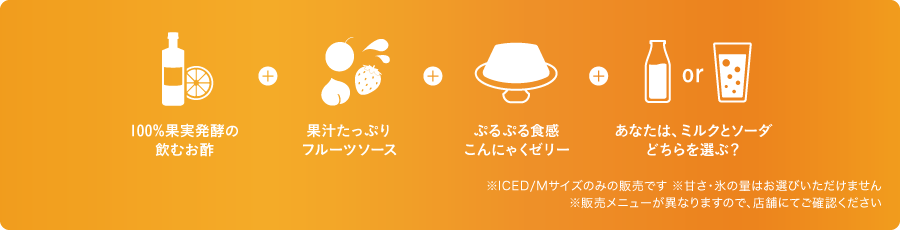 『フルーツ ビネガー』は、100%果実発酵の飲むお酢「美酢」とフルーツソースの組み合わせ、そして、こんにゃくゼリーの食感を楽しめることから、発売以来、大変ご好評をいただいているドリンクです。